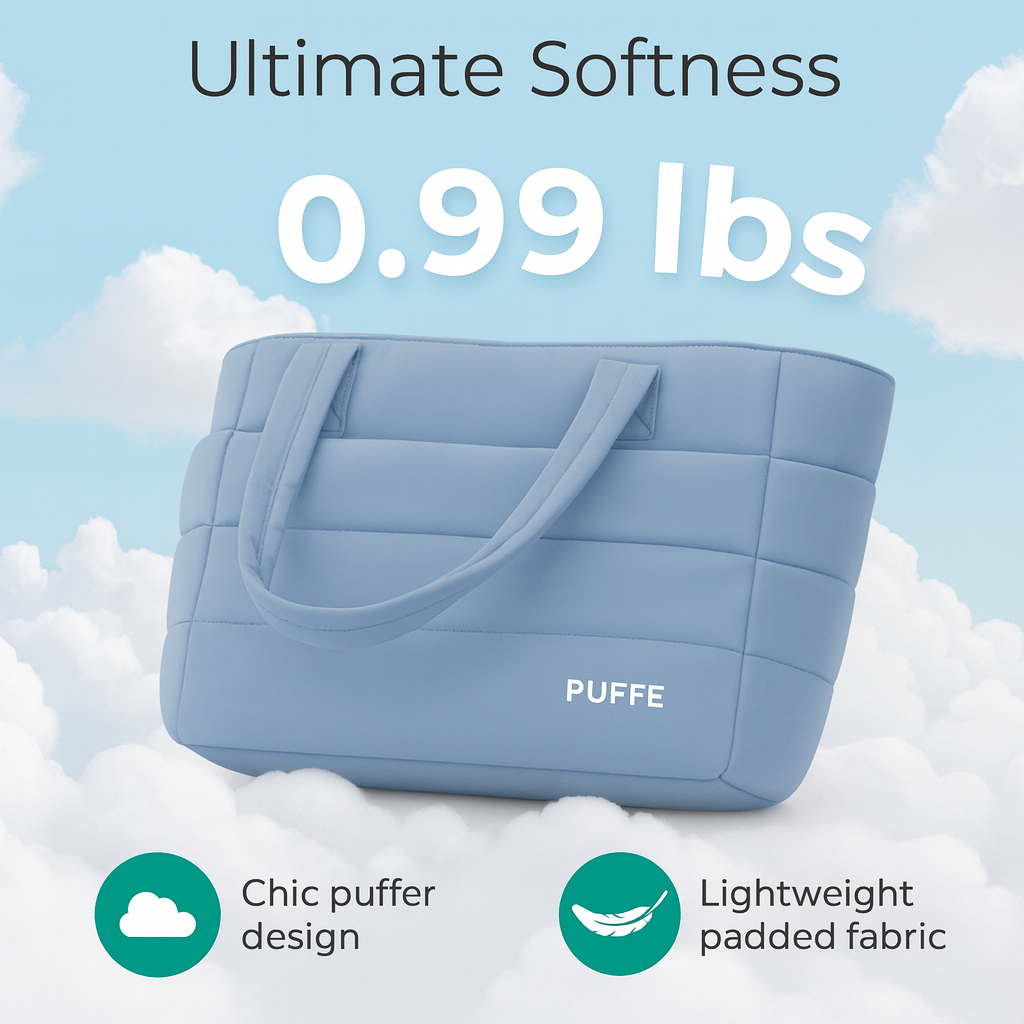 The Puffe Tote Bag™ is designed with a soft, cloud-puffy exterior and oversized interior that fits everything you need — while keeping your outfit looking aesthetic and elevated. Perfect for work, school, gym, errands, brunch, and weekend travel.